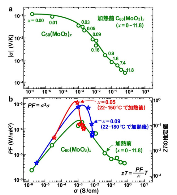 また、C60(MoO3)x薄膜の加熱処理によるσとαの変化を調べたところ、約100℃までの加熱では、組成xに関わらず熱電特性はほぼ一定であることから、C60(MoO3)x薄膜は室温駆動の素子材料として優れた熱的安定性を有することが分かりました。さらに、x = 0.05およびx = 0.09の複合膜をやや高温(110~180℃)で加熱すると、PFの値が急激に増加しました(図3bの赤☆および青☆)。PFの増加は低σ領域において起きることから、C60(MoO3)0.05複合膜のzTは0.81 と推定されます。この値はこれまで報告されている有機熱電材料としては最も高い値です。