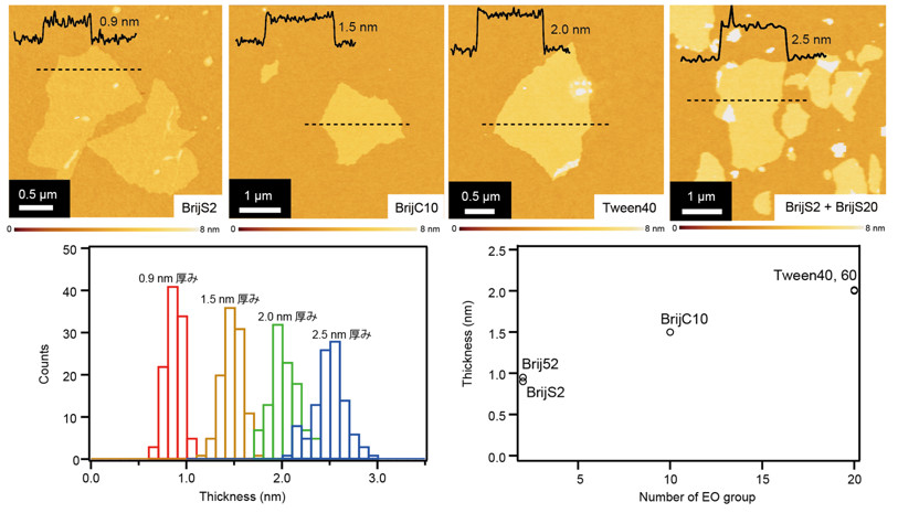 図1:(上)アモルファスシリカナノシートの原子間力顕微鏡(AFM)注6) 像と(左下)それぞれの厚みの分布と(右下)PEO数と厚みの関係