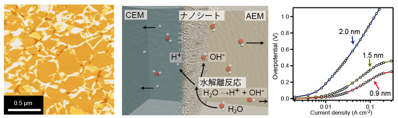 図2: (左)アモルファスシリカナノシート集積膜の原子間力顕微鏡像と(中)水解離触媒の概要図 および(右)水解離反応の過電圧注7) と厚みの関係。
