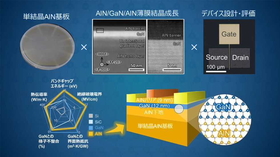 名古屋大学未来材料・システム研究所の須田 淳 教授、天野 浩 教授らと旭化成株式会社の研究グループは、窒化アルミニウム(AlN)基板上にコヒーレント成長させたAlN/GaN/AlN 高電子移動度トランジスタ(HEMT) を実現し、従来のGaN HEMTと比べ2倍以上の耐圧性能、低抵抗化、そして電流コラプスの抑制を実証しました。本成果は、通信・レーダー向け高周波デバイス注5) の飛躍的な性能向上に直結する重要なブレークスルーです。