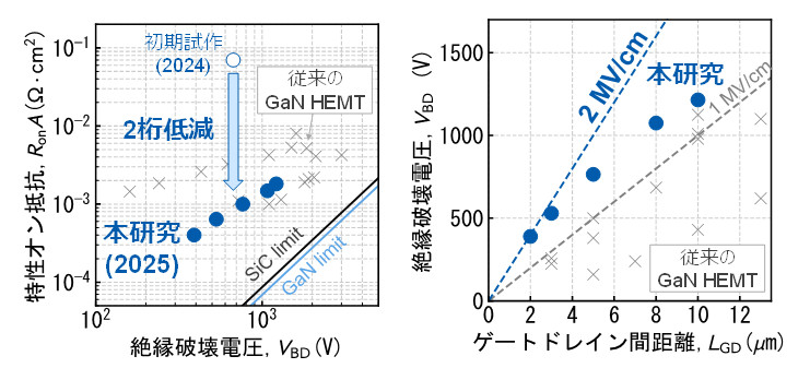 図2: (a)絶縁破壊電圧とデバイスの特性オン抵抗の関係。 (b)ゲートドレイン間距離と絶縁破壊電圧の関係。