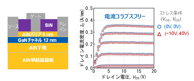 表面保護膜の導入により電流コラプスが完全に抑制され、表面欠陥の影響が低減されていることが確認されました(図3)。電流コラプスは結晶内部の欠陥にも起因するため、この結果はAlN基板上のAlN/GaN/AlN構造が極めて高い結晶品質を有することを示しています。これらの成果は、高周波デバイスの高性能化に向けた重要なブレークスルーです。